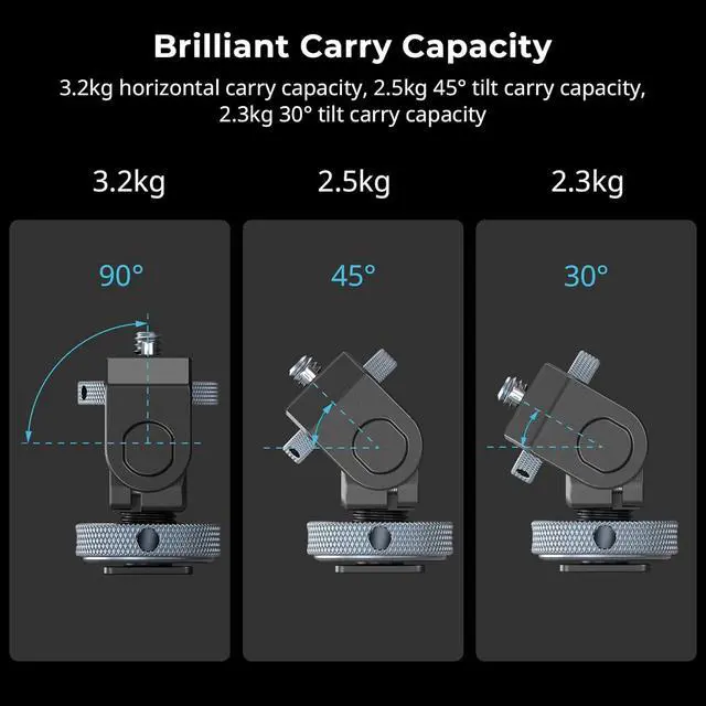 Max Load Capacity: 90° tilt load capacity is 3.2 kg, 45° tilt load capacity is 2.5 kg, and 30° tilt load capacity is 2.3 kg. Its tightness is adjustable on each axis