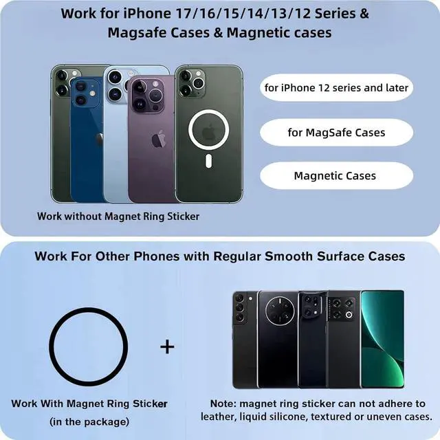 Work for All PhonesFor magsafe phone ring holder, it is designed for iPhone 16/15/14/13/12 series. Compatible with iPhone 16 Pro Max/16 Plus/16 Pro/16/15 Pro Max/15 Plus/15 Pro/15/14 Pro Max/14 Plus/14 Pro/14/13 Pro Max/13 Pro/13/13 Mini/12 Pro Max/12 Pro/12/12 Mini, and other phones with Mag-Safe Cases. For iPhone 16/15/14/13/12 series, move magnetic phone finger holder to the back of your phone or magnetic phone case. Auto-align in an instant! For other models phone, attach the metal ring (in the package) to the back of your phone case if you use case. Then stuck the finger phone ring on the metal ring, which is suitable for most smartphones.