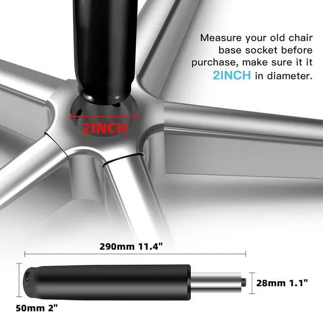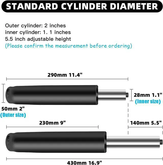 STANDARD OUTER SIZE: Outer cylinder diameter 50mm (2 inches). Inner cylinder diameter 28mm ( 1.1 inches). (salon chairs, executive chairs, work chairs, rolling stools) on the market, and has a better load-bearing capacity.