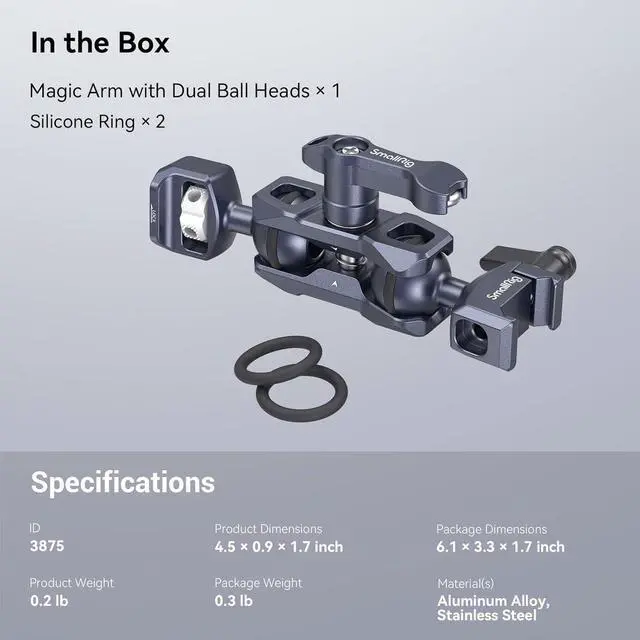 • With NATO Clamp - SMALLRIG Magic Arm 3875 features one 1/4"-20 Screws and one NATO Clamp on the end. Each ballhead is 20mm in diameter. Max. load capacity is 6kg
