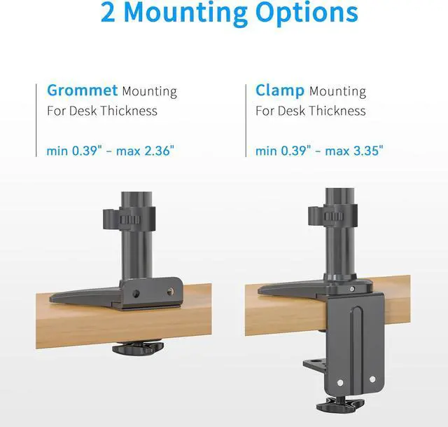 [TWO MOUNTING OPTIONS] This desk mount can be fixed by C-clamp (max thickness 3.35" /85mm) on the edge of the desk OR grommet installation (max thickness 2.36" /60mm, suggested hole size 0.3 - 2.0" /8mm-51mm)) for desks with no clearance in the back. Both desk clamp and grommet mounting options are available in the box.