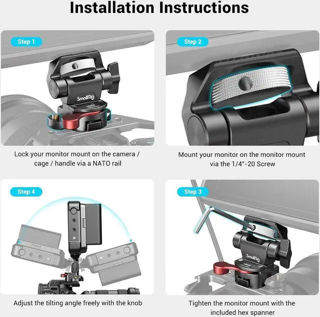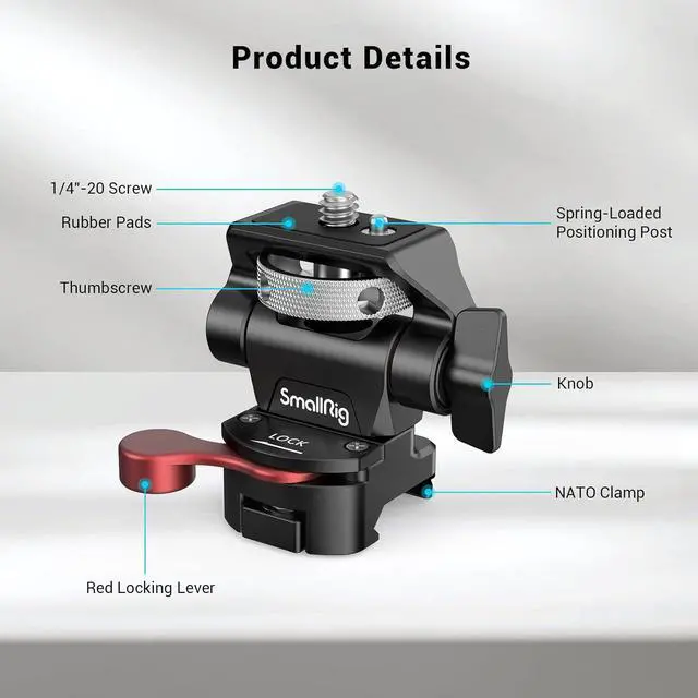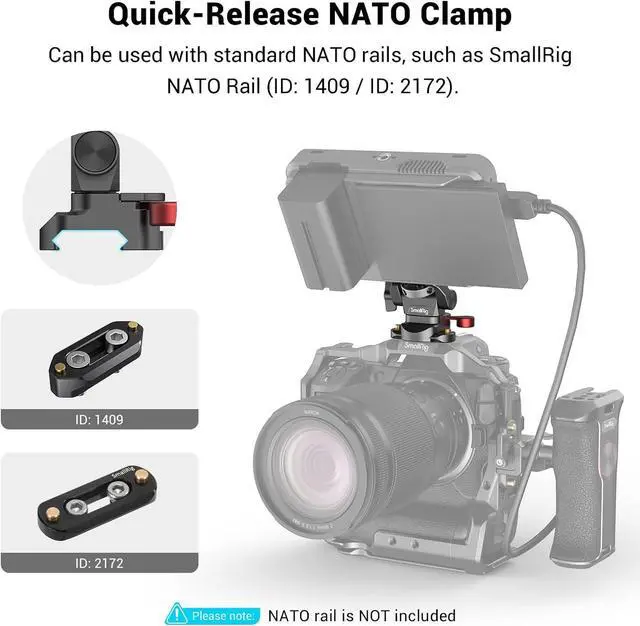 Quick-Release NATO Clamp: The NATO clamp mount can be used with standard NATO rails, such as SMALLRIG 1409/2172, which can realize quick disassembly and assembly, and makes your shooting more efficient and time-saving.