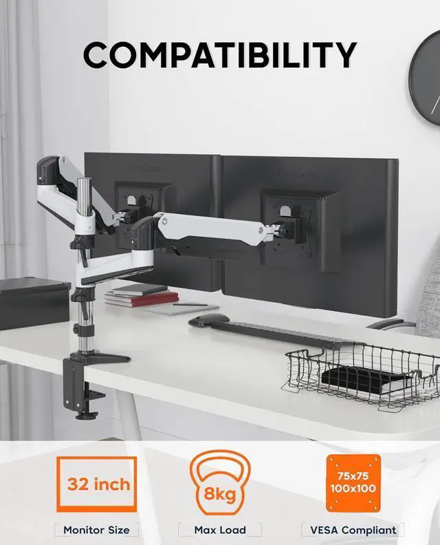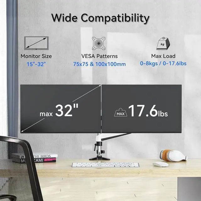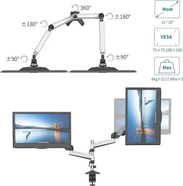 [WIDE COMPATIBILITY] Hold two 15"-32" monitors, each arm holds up to 17.6 lb/8kg monitor with 75mm x75mm or 100mm x 100mm VESA mounting holes.
