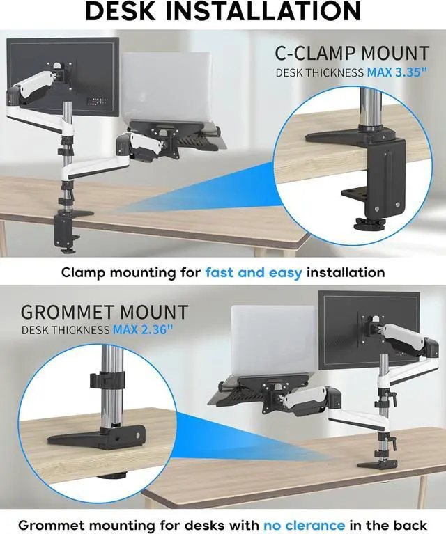 [TWO WAYS TO MOUNT] This Fully adjustable desk mount can be fixed by C-clamp (max thickness 3.35" /85mm) OR grommet installation (max thickness 2.36" /60mm) on any working surface. Both desk clamp and grommet mounting options available in the box.