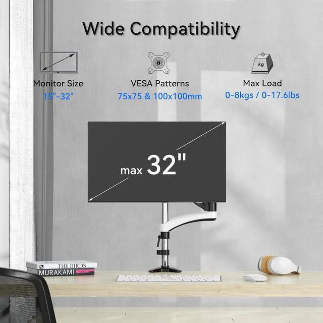 • [COMPATIBLE WITH VESA MONITORS] Hold one 15"-32" monitor, maximum weight capacity of 17.6 lbs/8kg monitor with 75mm x75mm or 100mm x 100mm VESA mounting holes.