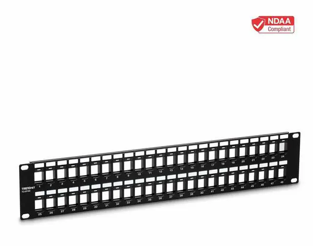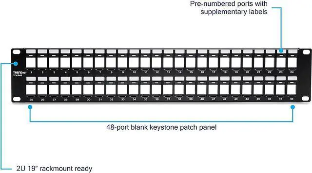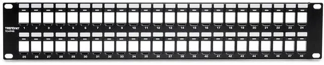 PATCH PANEL: The 48-Port Blank Keystone 2U Patch Panel supports standard sized keystone jacks for audio video and data; Recommended to be used with TRENDnets Cat6 keystone jacks TC-K25C6 and TC-K50C6 (Sold Separately)