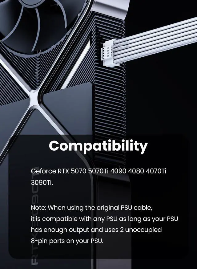 Designed for RTX 4070ti /4070 /3090ti /4080 /4090Fasgear 12V-2x6 PCIe 5.0 16(12+4)pin male to 2*8(6+2)pin female sleeved extension GPU cable is designed for GeForce RTX 4070ti / 4070 / 3090ti / 4080 / 4090 GPU. That means, this cable can extend the length and work well with the original power cable to get a stable and reliable performance.