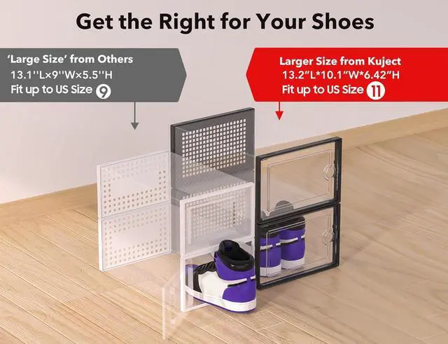Extra Large Capacity- 13.2L * 10.1W * 6.42H: The upgraded large shoe box is wider and higher. It fits womens shoes up to size 12 (US) and mens shoes up to size 11 (US), which is suitable for many types of shoes such as boots, leisure, sneakers and high heels.