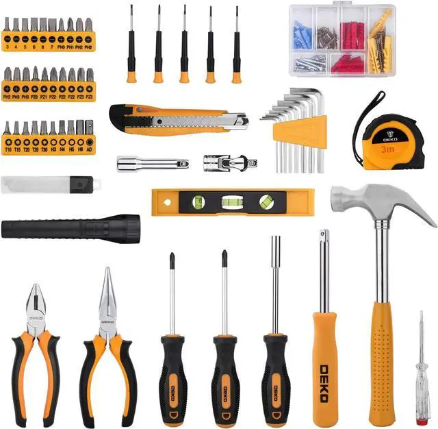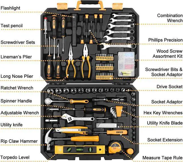 COMPLETE ACCESSORIES: Rich accessories of updated tools placed in this tool set. Includes combination wrench, phillips precision, long nose plier, linemans plier, test pencil, flashlight, adjustable wrench, rip claw hammer, spinner handle and more