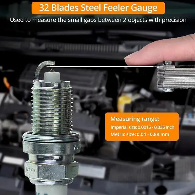 32 Blades Steel Feeler Gauges: Included in this set is a set of 32 blades steel feeler gauges ranging from 0.0015 to 0.035 inch ( 0.04 - 0.88 mm). Constructed from hardened tempered steel with a lube oil coating, these gauges prevent pitting and corrosion, making them ideal for measuring tappet clearances, spark plug gaps, bearing clearances, piston ring gaps, and other hard-to-reach areas