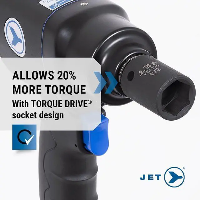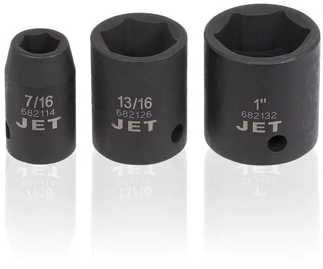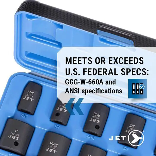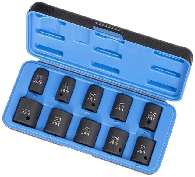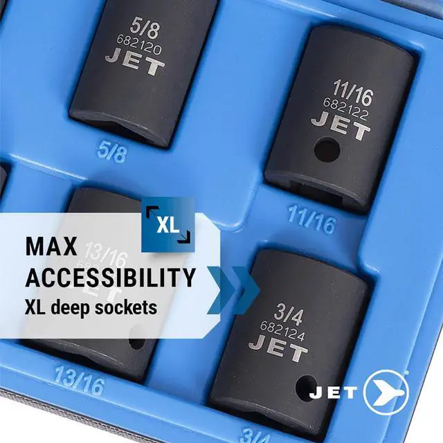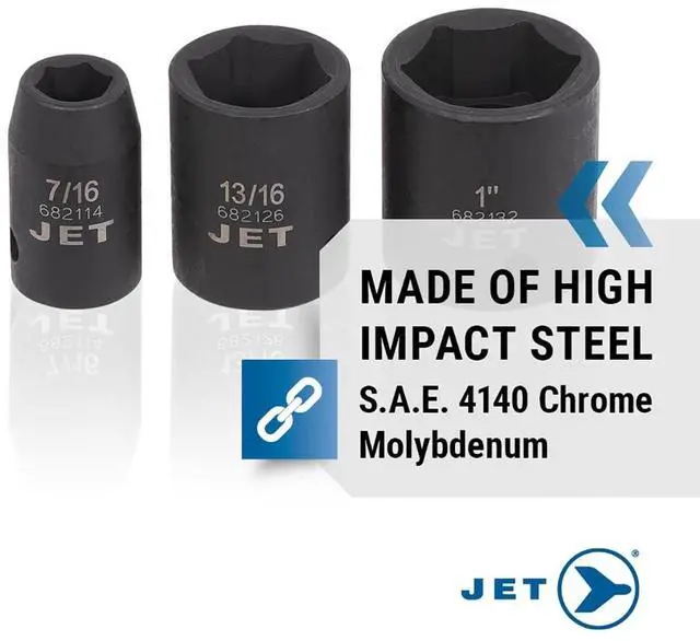 IMPACT SOCKET SET - JET's 10-piece 1/2" Drive Standard SAE Impact Socket Set is made of durable high impact steel S. A. E. 4140 Chrome Molybdenum; Extra long deep sockets ensure maximum accessibility