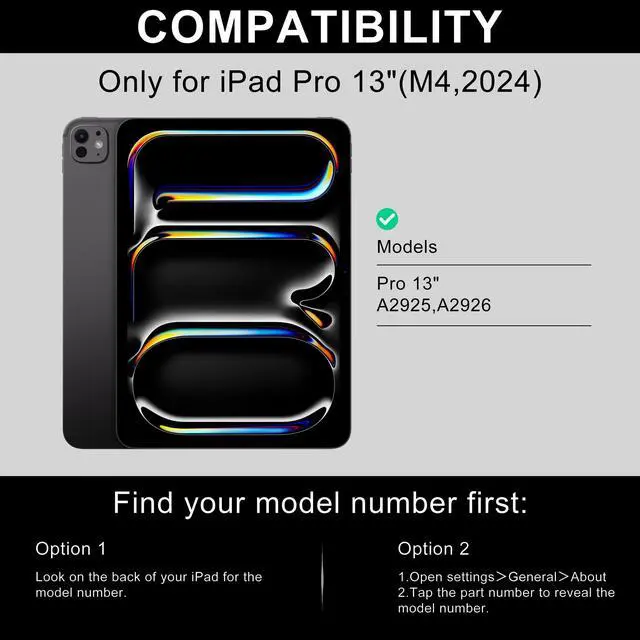 [(Keyboard Case for iPad Pro 13 inch 2024)] This iPad keyboard case is perfectly for New iPad Pro 13 Inch (M4) released in 2024 (Models:A2925/A2926/A3007). NOT compatible with any other iPad models. Please check back bottom of your iPad to find the model number.