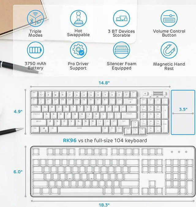 96 Keys, Redefine Full-Size Keyboards - Only 6 keys missing, the 96% keyboard with a number pad and offset arrow keys is built for productivity and a tactile typing experience.