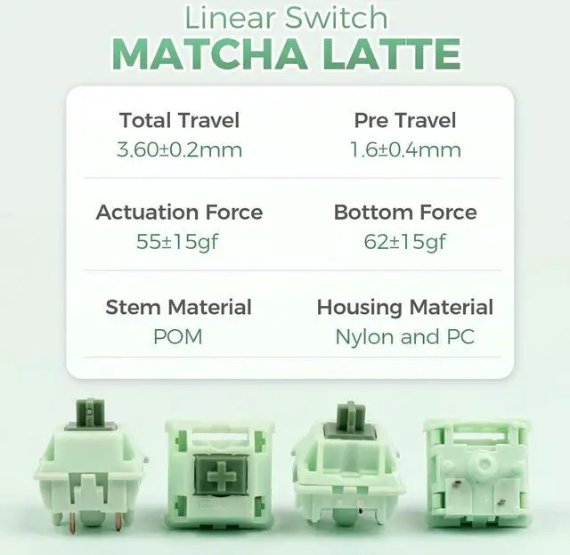 Silky Smooth Linear TravelTrue to its name, the KiiBOOM Matcha Latte offers the silky smooth typing feeling, recalling the feeling of matcha latte touching the tongue. With 3.6 millimeters of total travel and an operating force of 55g, these cute matcha green switches have a long round trip for every keystroke, while keeping the same consistent resistance from start to finish. The housing is precisely molded to have an even lower surface roughness finish, which ensures an ultimate smooth glide