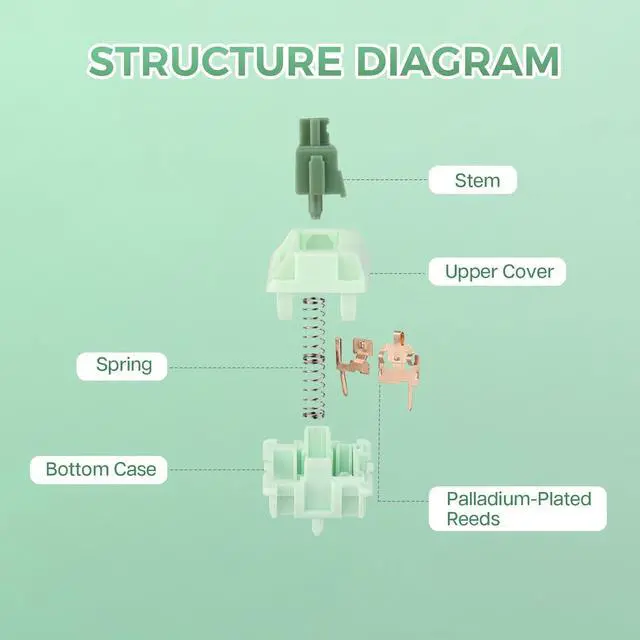 Self-lubricating POM StemA keyboards switches are primary in offering the intuitive tactile feeling of every press. Within a switch itself, the feel can be fine-tuned even further - starting with the stem. Meticulously fined engineered by KiiBOOM, the Matcha Latte switches stem is made of POM, which will be self-lubricating with each keystroke. Eventually, the more frequent you use the switches, the smoother they will be.