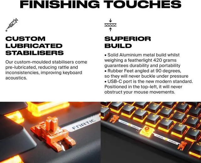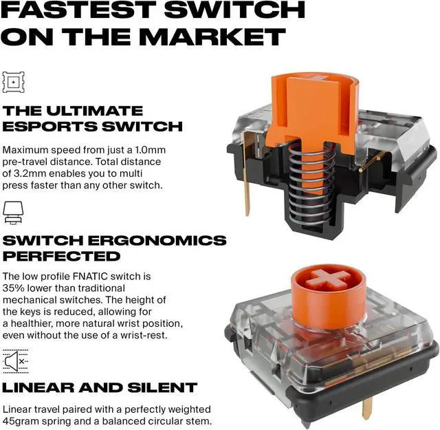 FNATIC LOW PROFILE SWITCHES: Linear and silent, ultra fast switches, offering just 1.0 mm actuation distance and reduced total travel for faster multi-presse whilst providing significantly improved hand ergonomics.