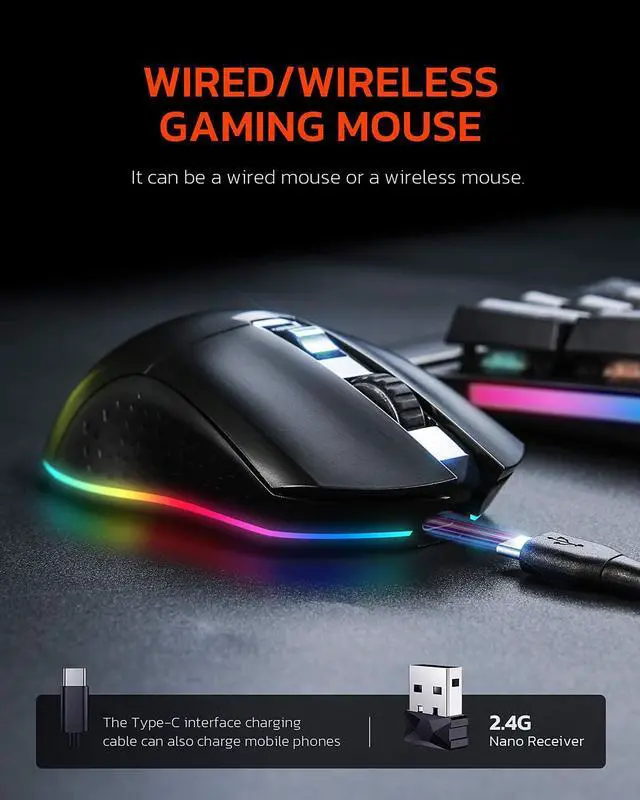 Wireless & Wired & Type-C Rechargeable Mouse gaming mouse can work as wired gaming mouse or wireless gaming mouse. Connect the mouse to the computer with the Type-C interface charging cable, and it will automatically switch to wired transmission mode.