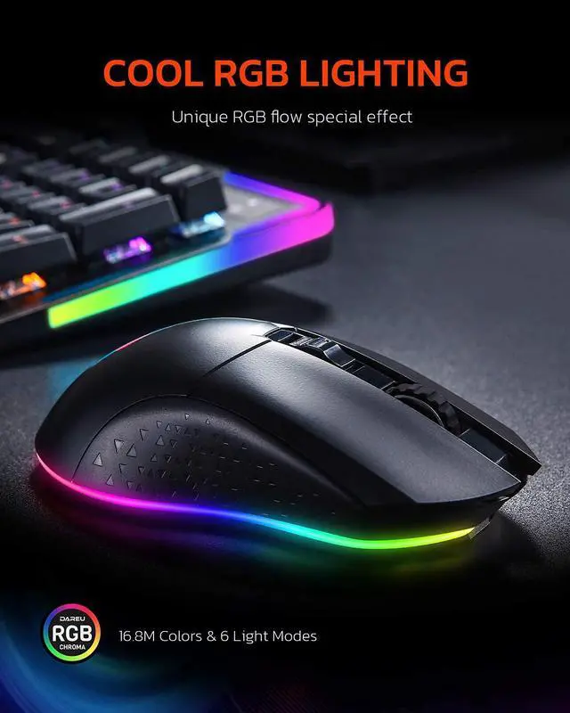 Cool RGB lightingThe bottom light strip of the gaming mouse has a unique rainbow RGB mice streamer effect. With multiple RGB lighting modes, you can choose the gaming mouse RGB lighting you want