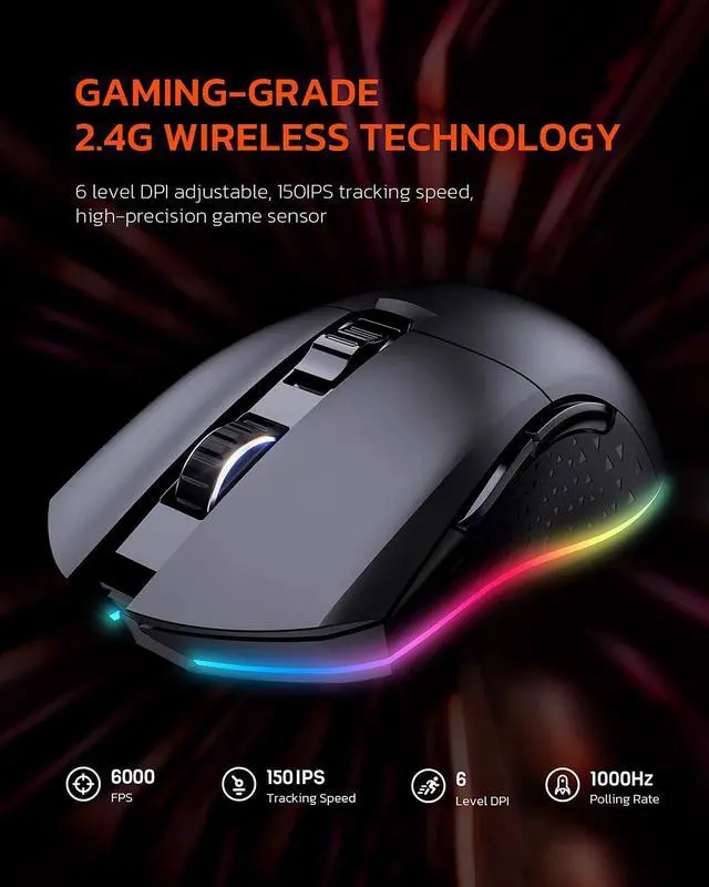 Wireless Transmission in Gaming LevelMillisecond wireless transmission brings stable signal as wired mice do, user could enjoy smoth gaming fighting. The wireless gaming mice is almost equivalent to the transmission performance of a wired gaming mice. Please rest assured.