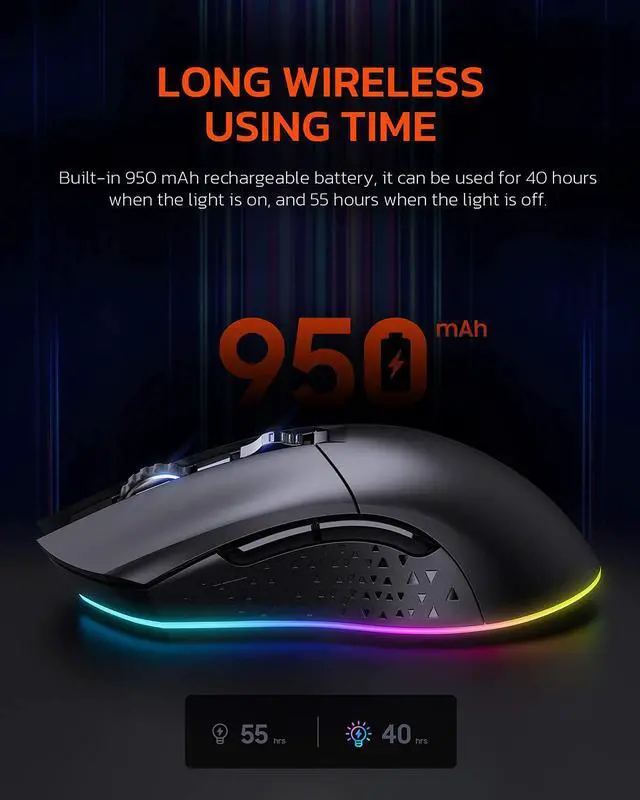 Long time wireless useBuilt-in 950 mAh rechargeable battery, it can be used for 40 hours when the light is on, and 55 hours when the light is off. You can use the Type-C data cable to charge the gaming wireless mouse and it will switch to wired gaming mouse mode. In this way, you dont have to worry about running out of battery power during the FPS gaming or other gaming.