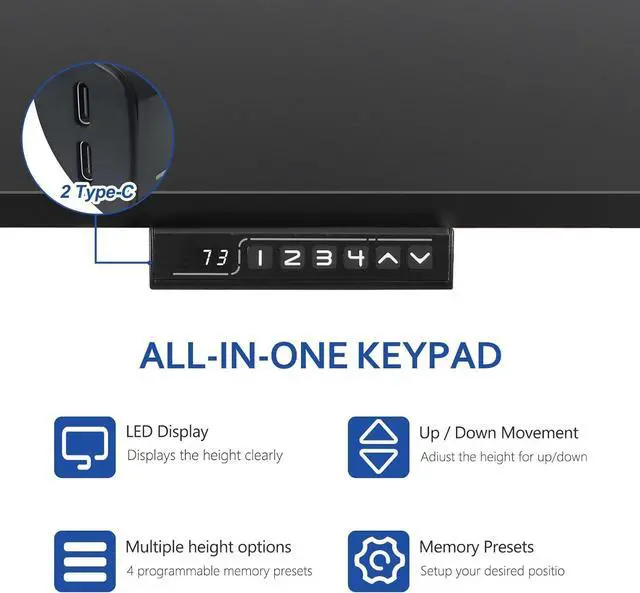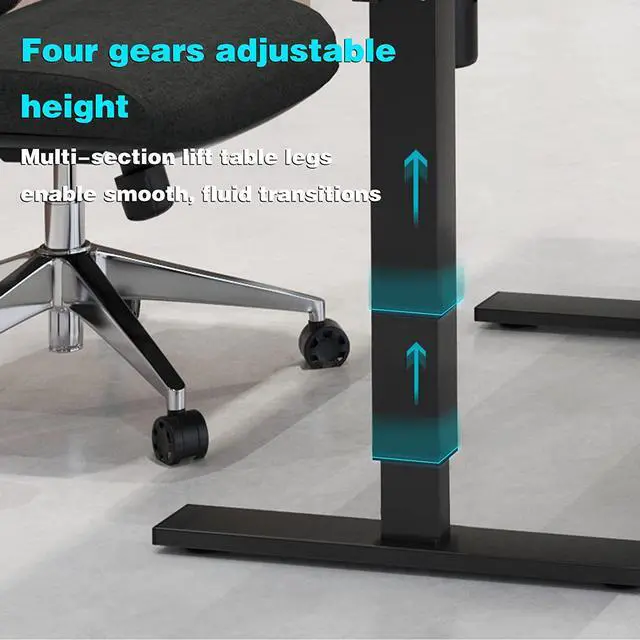 Electric Lift SystemThe motor lift mechanism offers smoother height adjustments, this computer desk can be adjusted 4 different heights from 28.3" to 47.4" with 0.8" thickness of table top included), at a speed of 1"/second with low noise (under 50 dB) while running.