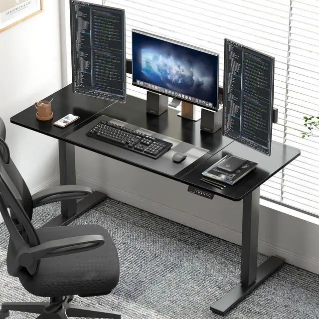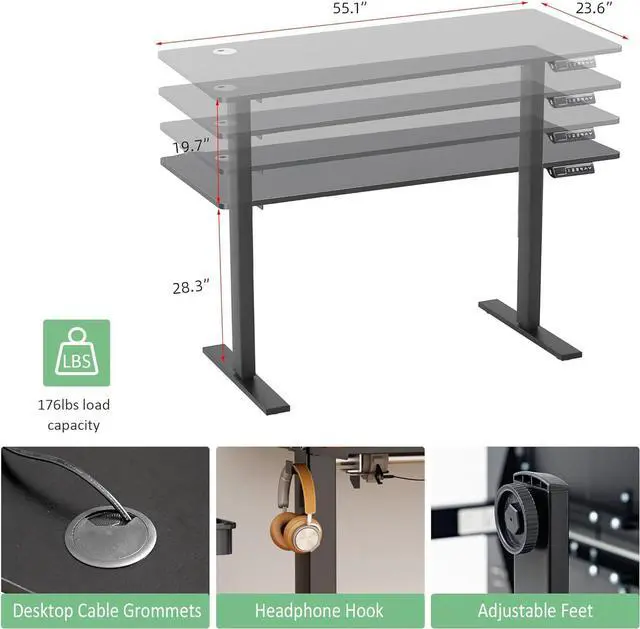 Large Work Space: The electric height adjustable desk large area work surface with splice board measuring 55"x 23.6" is environmentally sourced and provides ample space for a variety of monitor or laptop setups, plus room for ongoing projects and office supplies. The electric sit stand desk is made of an industrial-grade steel frame combined with a solid desktop allows for a 176 lbs weight capacity to support your ideal workspace setup.