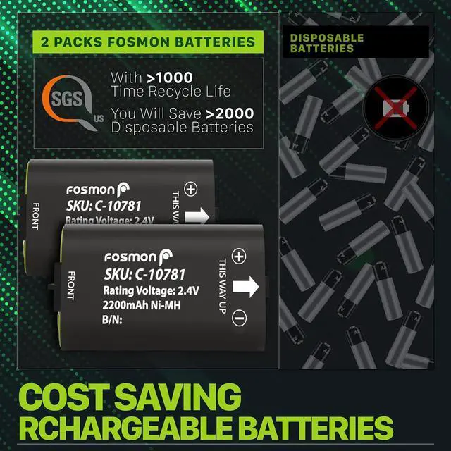 [COST SAVING RECHARGEABLE BATTERIES] How many disposable batteries have you thrown away? Have you thought of how much money it would save to say goodbye to using AA batteries in your controllers? With Fosmon high capacity 2200mAh rechargeable batteries, you will save hundreds of dollars and thousands of AA batteries. The rechargeable battery is compatible with latest Xbox Series X/S (2020 Version), also backward compatible with Xbox One/One S/X and Elite Controllers.