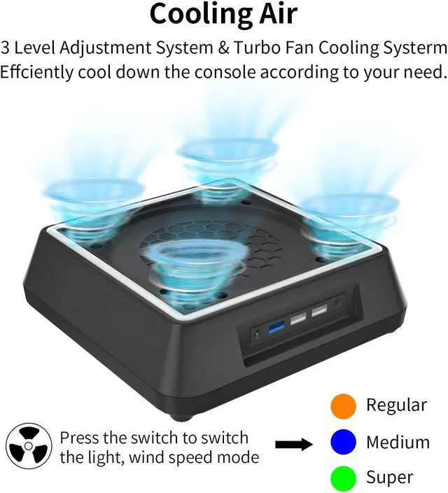 Efficient Adjustable Cooling SystemRather than small fans, Mviioe for xbox series x stand is equipped with one large heavy duty fan, providing more effective air flow distribution with 3 level speeds-1800/ 1900/ 2000 RPM. Mviioe for xbox series x fan cooling system has 3 indicators--orange for regular, blue for medium and green for super.