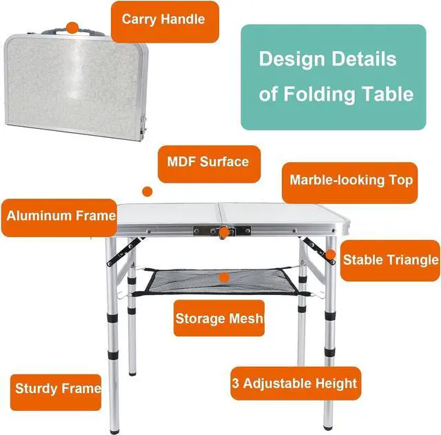 Lightweight but Solid-This foldable table is made of sturdy aluminum, the table top is outdoor MDF, and the legs of the table are of aluminum alloy. The marble-looking top surface combines with the aluminum outer edging/frame to make a look very similar to grandmother's kitchen table. It is stable, solid, hard-surfaced, and reasonably strong.