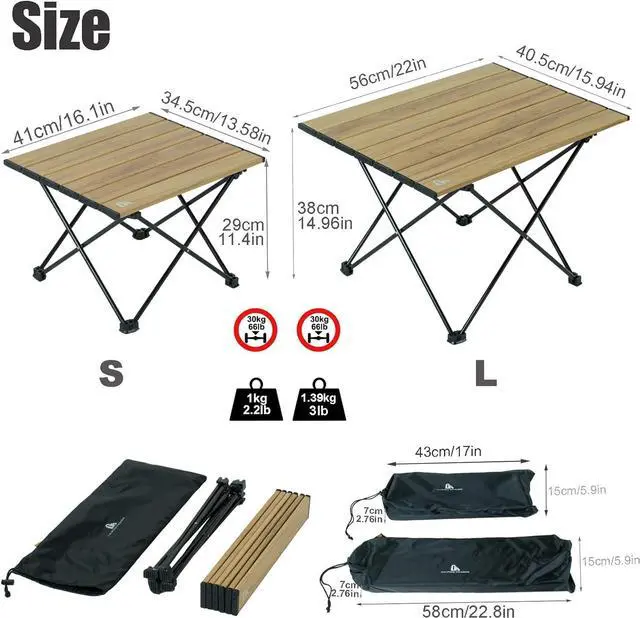 Sturdy and ultralight, made of aerospace-grade aluminum alloy, only 3 lbs; Max Load 66 lbs; Unlike wooden or nylon-top tables, this table is durable, waterproof, corrosion-resistant, easy to clean; Sturdy joints and connectors, plus anti-slip rubber feet make this table more stable, and the legs won't fold, bend, or disengage on different terrain; Very easy to set up, just open the base frame and attach the table top, enjoy your leisure time in seconds, you can also check the video in this page to see more details