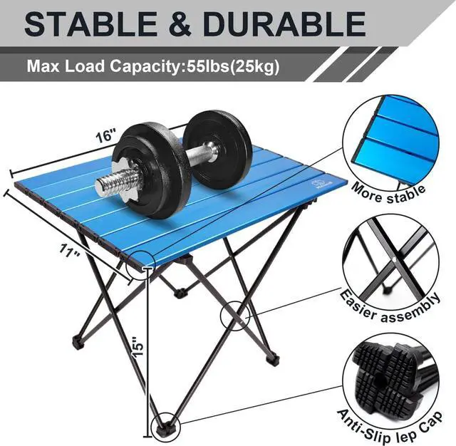 [PREMIUM MATERIAL & RUSTLESS] The table board is made of durable aluminum material, unlike wooden or nylon-top portable tables, the aluminum desktop covered with high-quality spray which are waterproof, anti-corrosion, ovenproof, scratch-resistant, and long-lasting use time and easy to clean by paper and cloth. You can also use table in the rain day because the table is without rusting.