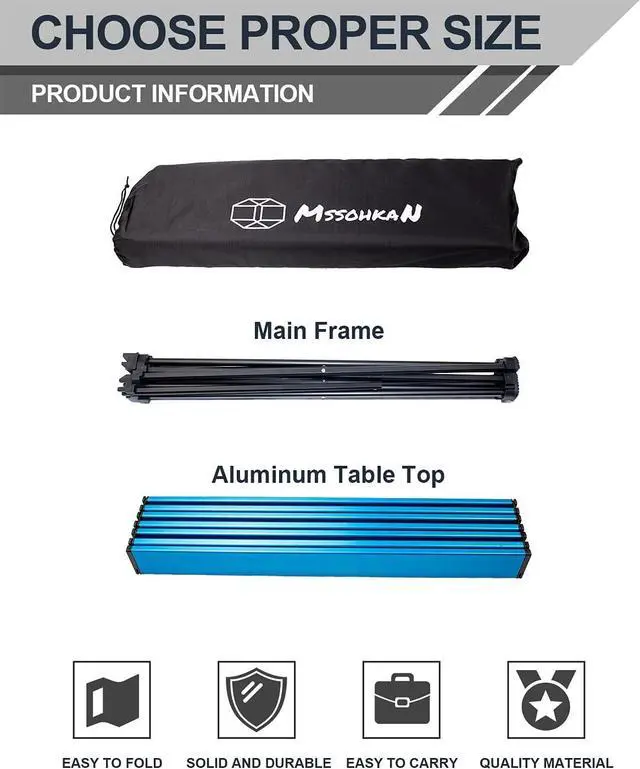 [STABLE & DURABLE] MSSOHKAN provides a stable work surface for hobbyists. This camp table is made of heavy duty aluminium alloy, has a flat top and cross legs, and all four legs are equipped with skidproof foot cover, it stays stable in any flat terrain. The table legs use the high intension aluminium alloy, the bearing capacity is strong, it is not easy to bend and deformation. The aluminum frame and table top connection is compact, solid design can sustain maximum 55 pounds.
