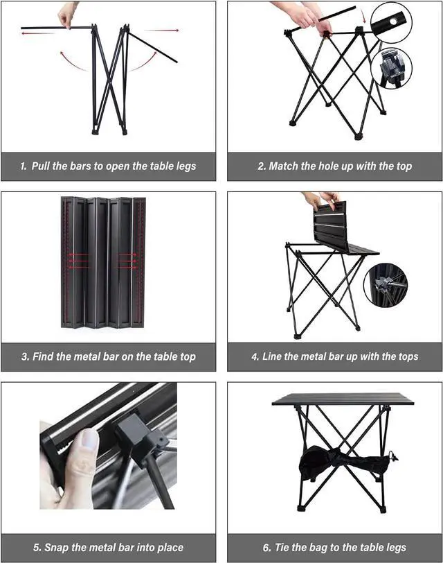 [EASY TO ASSEMBLE - NO TOOLS NEEDED] This sturdy camping table is composed of an aluminum X-shaped frame that is snapped together, which is designed to pop up and fold with ease. Its unique hinge design enables easy and robust connection to the table top. Just pop it open and attach the table top and you are ready to use it! You can even assemble this in one minute! It is so easy that a kid can do it!