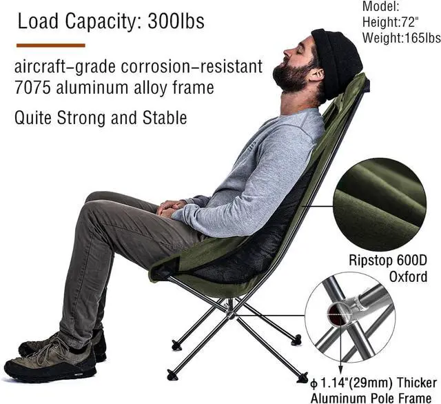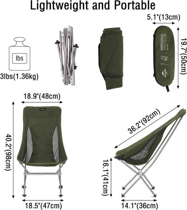 Strong Aluminum Construction: Naturehike camp chair is made of aerometal-aircraft grade aluminum which is ultralight and sturdy. This hiking chair weighs about 3lbs and can support up to 330lbs.
