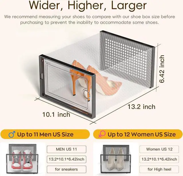 Extra Large Capacity- 13.2L * 10.1W * 6.42H: The upgraded large shoe box is wider and higher. It fits womens shoes up to size 12 (US) and mens shoes up to size 11 (US), which is suitable for many types of shoes such as boots, leisure, sneakers and high heels.