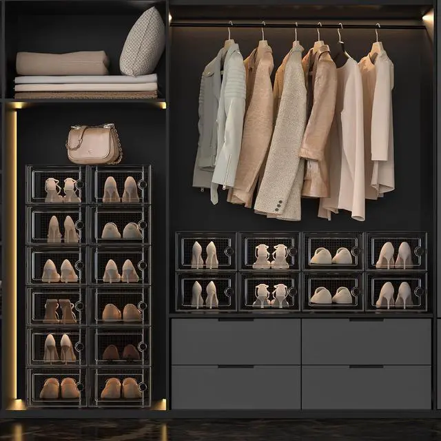 Organize your shoes in clear and uniform boxes: Whether placed in a hallway or closet, the shoe boxes will make your shoes well organized. And clear shoe boxes make it easier for you to find your shoes.