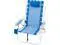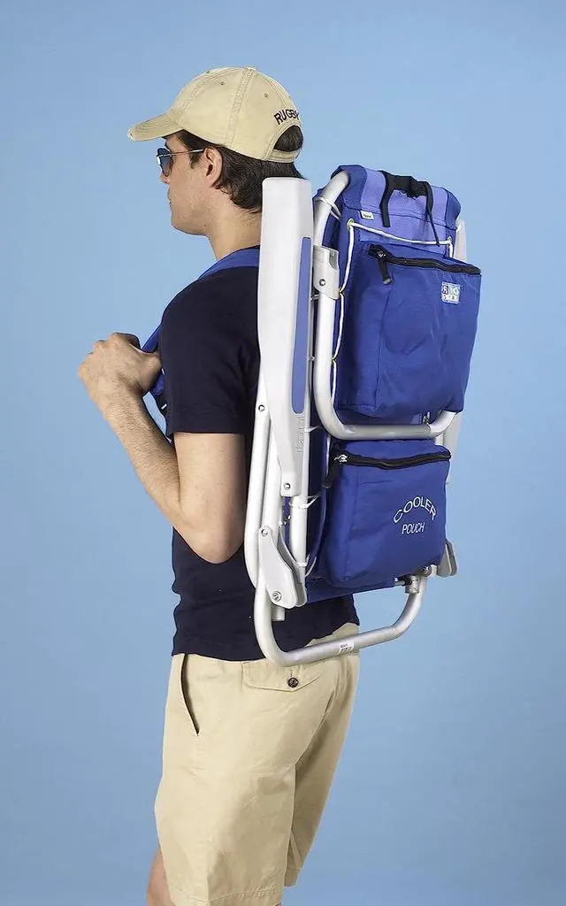 Aluminum frame backpack chair adjusts to 5-positions from upright to full recline with "towel rack" folding incline support bar