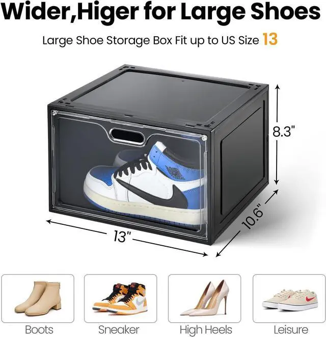 [Extra Large Capacity] 13.4L * 10.6W * 8.3H -The upgraded large shoe display boxes are suitable for US shoe size up to 13, which designed with a larger storage capacity. So dont worry about the shoe boxes space. The shoe display case can keep your messy shoes well organized. which is suitable for many types of shoes such as boots, leisure, sneakers and high heels.