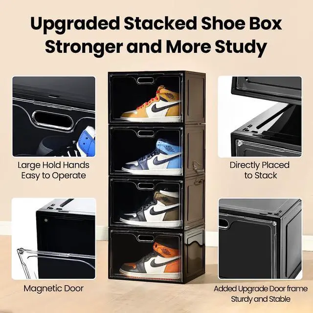 [Sturdy Material] The shoe organizer is made of sturdy plastic. The stackable shoe boxes can effectively prevent dust from entering in. Easy daily care clean with mild soap and water.