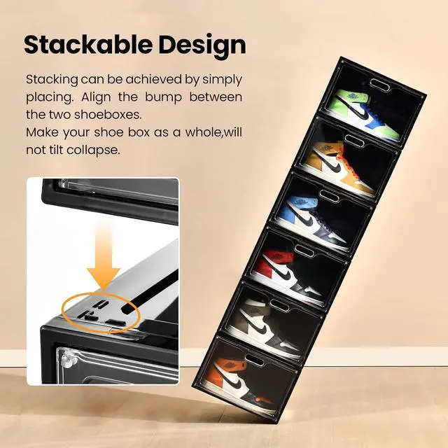 [Stackable Design & Space Saving]Our shoe storage boxes are equipped with stackable design, Which you can stack the shoe boxes by connecting points on the boxes. In addition, the stackable function can keep the shoe boxes whole very firmly and can be Multi-layered Stacked. And each stackable shoe bins can stay sturdy and easy to carry when integrated.