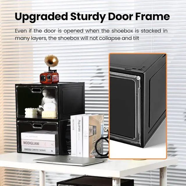 [Magnetic Door and Easy to Open with Single Hand]The shoe storage boxes have built-in magnetic function. The door can be easily opened and closed by the upgraded magnetic suction. In addition, we set vents in the door. Our stackable shoe box has excellent breathability to prevent the accumulation of odor.