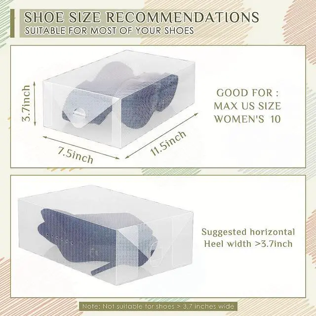 Large in Capacity: these stackable plastic shoe boxes are measured about 11.8 x 7.5 x 3.7 inches/ 30 x 19 x 9.5 cm, fits various types of shoes up to US size 9/ 10 for women or 10/ 11 for men, keeping your storage places tidy and clean; Please conform the size before purchasing