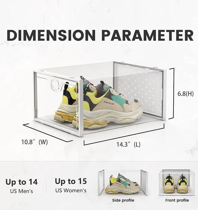 Large Capacity For Size 14The extra large shoe organizer have the size of 14.25 '' x 11.02 '' x 7.20 ''inches, which have a lot of space, you can put a 14 size sneaker or choose put two smaller shoes in it, these could make your room more tidy. Because of their large size, these xxl shoe boxes can be used for many other way, you can use them to carry different thing, which may not be used now but still need to keep. They will be sorted into cubes and stackable them let your room more cleaner!