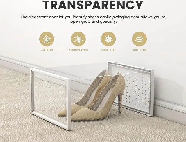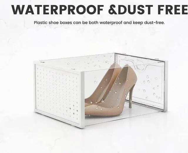 Sturdy and StackableThe clear plastic shoe box is made of sturdy plastic, which is hardness, firmness and no deformation plastic. And the big shoe boxes could stackable, because the rigid door frames and flexible plastic make them supportive while still being easy to disassemble and move.