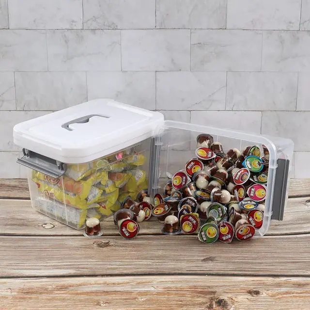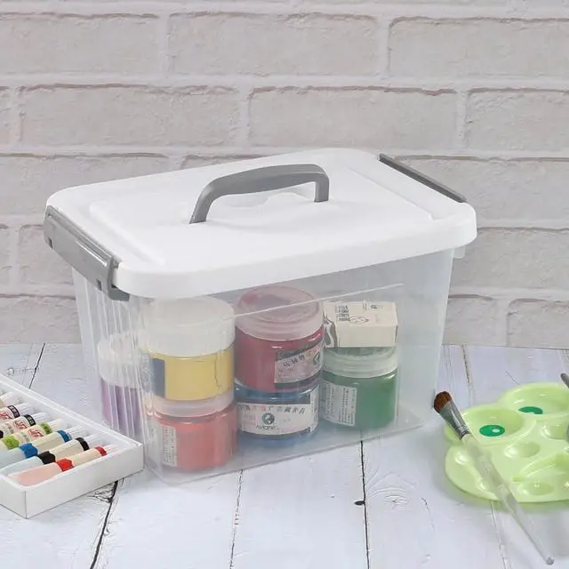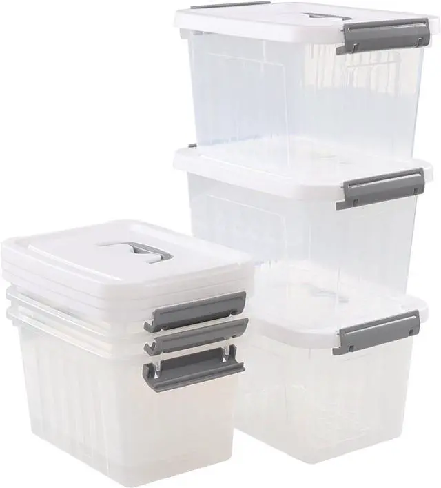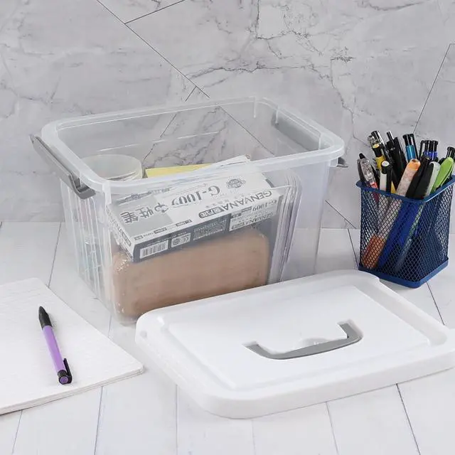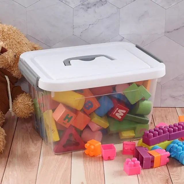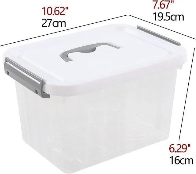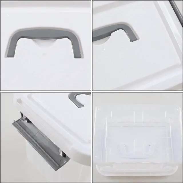 There is a handle on the top for easy carrying the plastic storage bin, and two latches on both side locking the lid make contents more securely