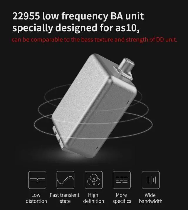 : KZ AS10 musician in ear monitor uses 5 driver, include one 22955 BA driver for Lows can be comparable to the traditional dynamic driver. 1 piece 296898 for Mids, 2 pieces 30095 for Highs, 1 pieces 31005 for Mid and High.