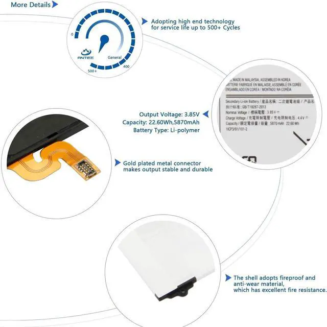 . ANTIEE PromiseEvery one of our replacement batteries has undergone rigorous testing to ensure the true charge capacity, circuit protection, stable current, low self-discharge. And our batteries are UL / CE / FCC / RoHS Certified for safety, it can provide up to 500 charging cycles over the life.