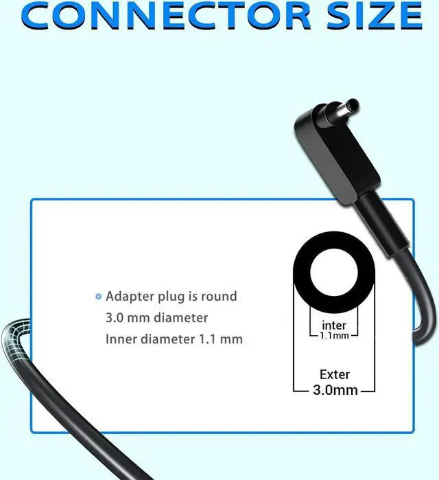 Connector Size: 3.0 mm* 1.1 mm(Mismatched with connectors of 5.5 * 1.7 mm in yellow and blue and black). Acer has multiple connector sizes, please pay attention to identifying connectors.
