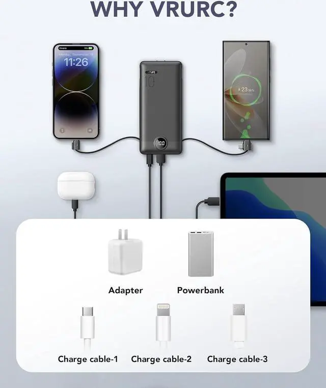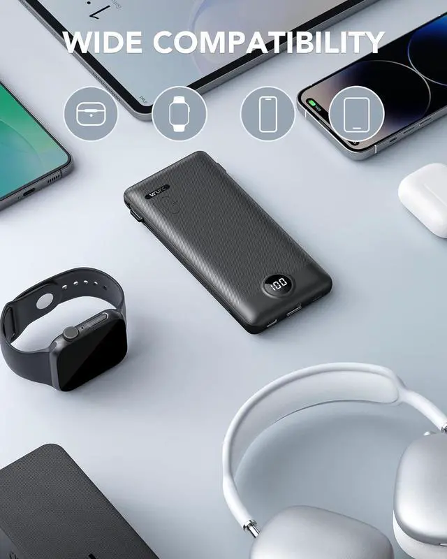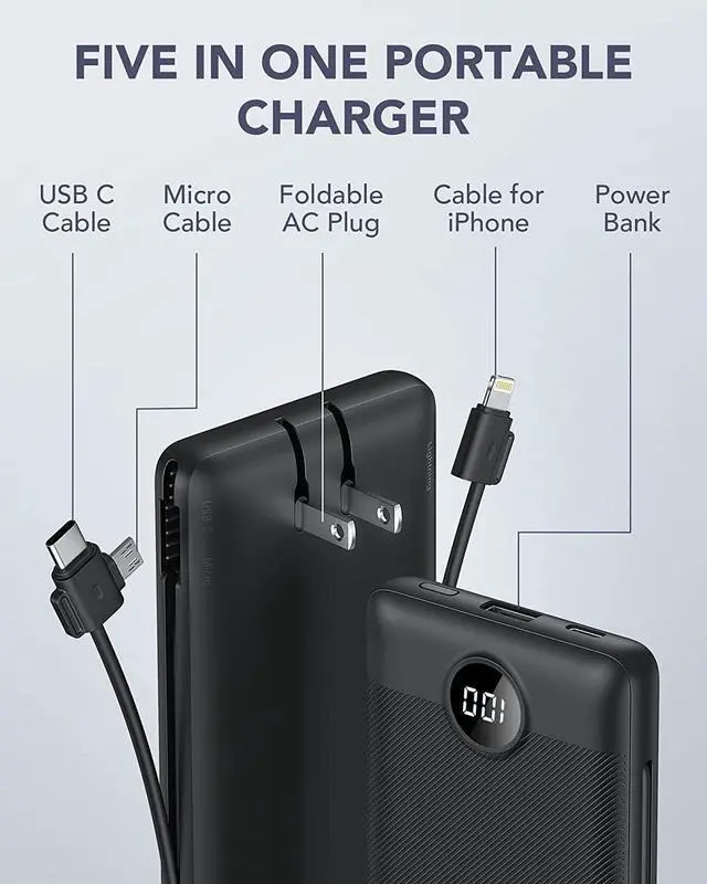 Portable Charger With Built-in Charging Cables and PortsThis USB C portable charger not only has a built-in micro cable, type C cable, and other data cables, but also is equipped with a USB input port, Type-C input, and output ports. Using the built-in cables to charge, the portable battery charger is compatible with iPhone, Android devices, and USB-C most mobile phones and smart devices. This external battery power bank can meet most of the charging needs of daily life.
