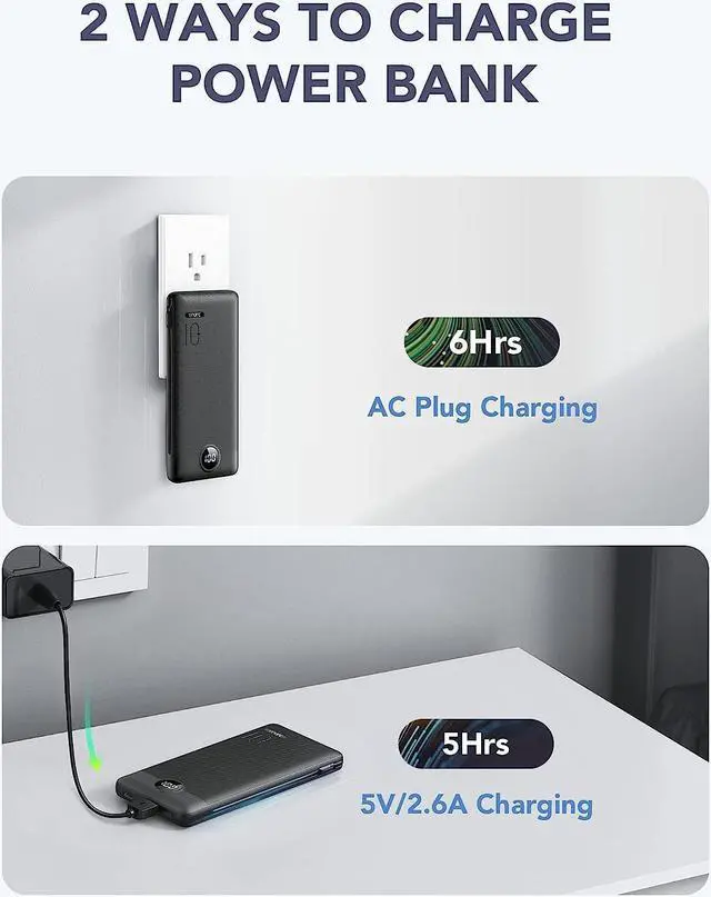 Two Way To Charge The Power BankOne is charging the power bank through the AC wall plug, it will be fully charged within 6 hours. The other is using the 5V/ 2.6A charging cable to charge the power bank itself, it will be fully charged within 5 hours.